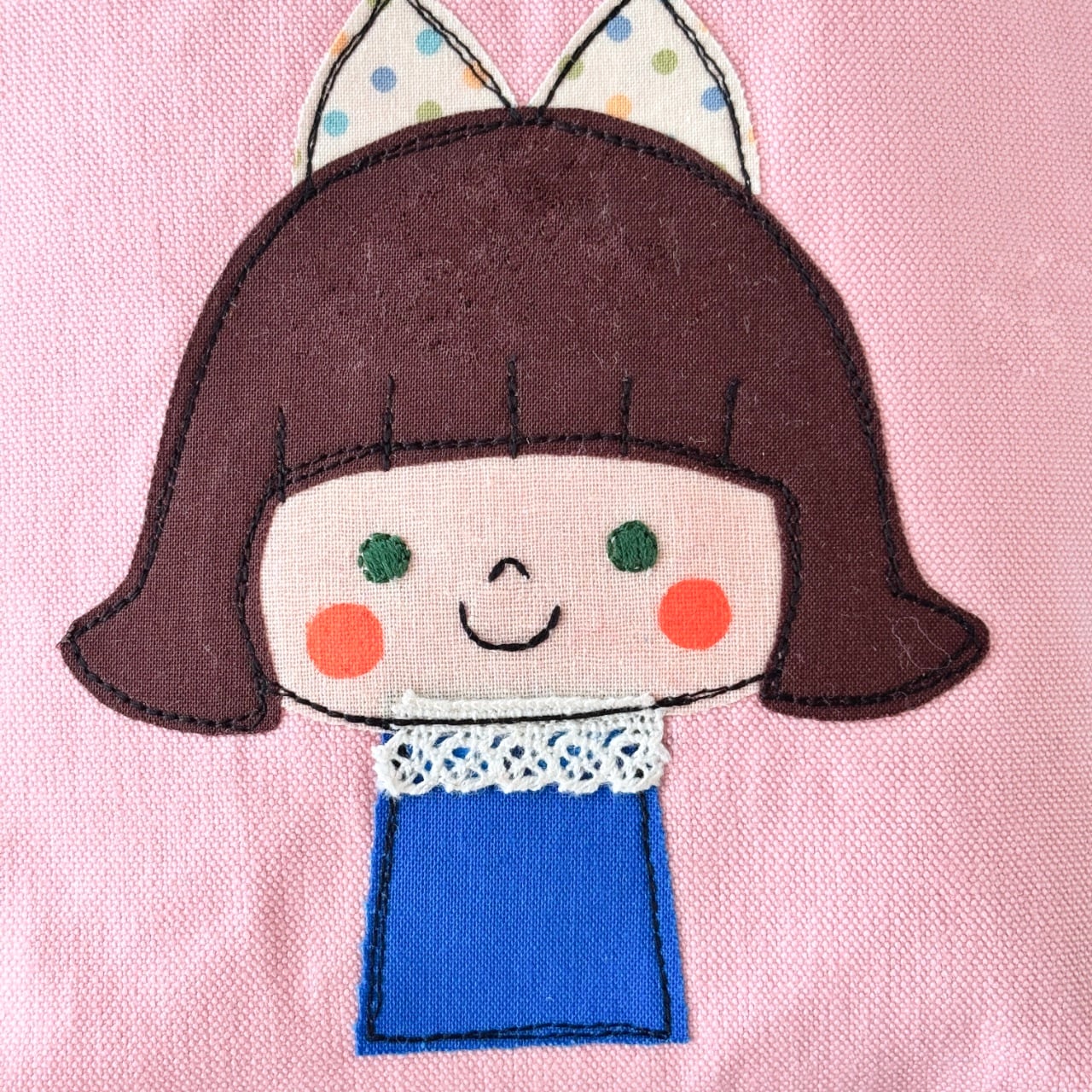 女の子のアップリケはコットン生地を使用し、接着シートを貼った上からミシンで刺繍しています。