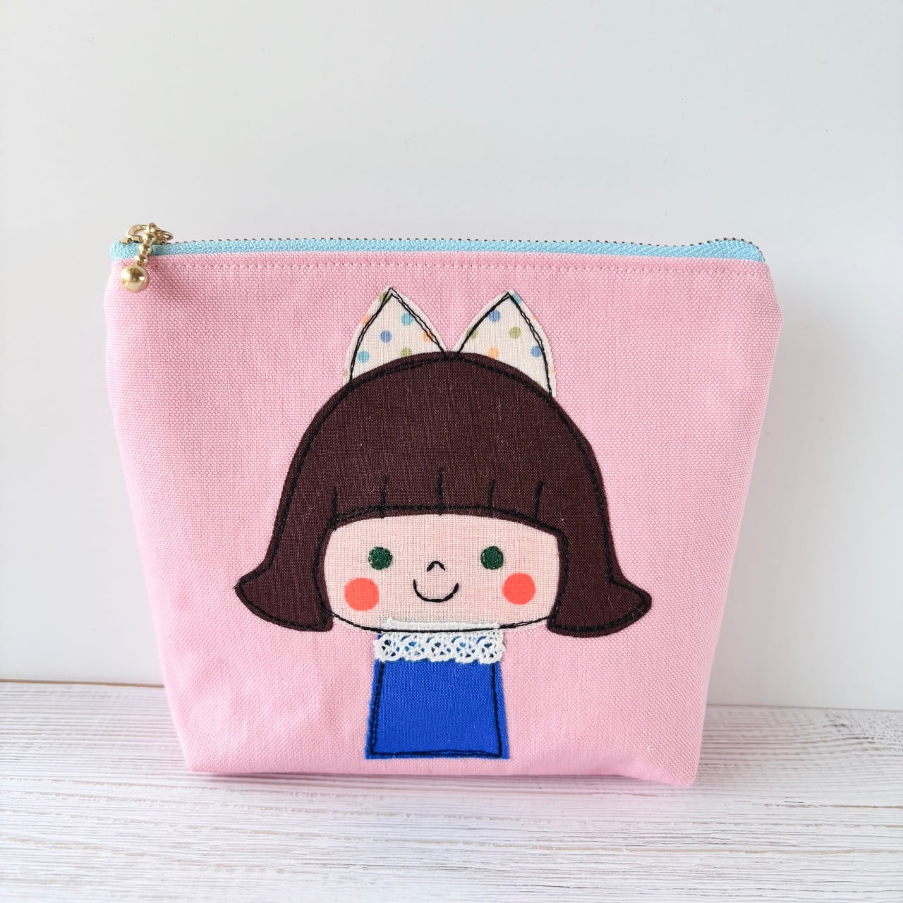 大きな水玉リボンをつけた女の子ポーチ(ベビーピンク)